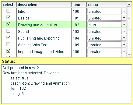 This sample demonstrates ActionScript 2.0 cell renderer classes that display CheckBox and ComboBox components in the cells of a DataGrid component. This sample also demonstrates how data value changes are updated between the DataGrid component and cell renderer classes that allow data manipulation.