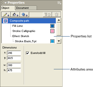 You can edit individual object properties by changing their attributes. The bottom part of the Object panel, or the attributes area, displays property attributes. The attributes area is context sensitive, displaying the attributes for the property that is currently selected in the Properties list.