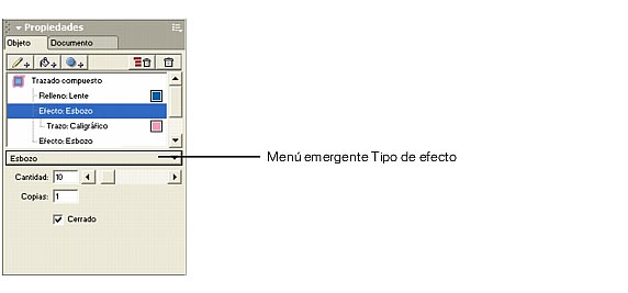 Los efectos automáticos vectoriales pueden crear los mismos efectos que otras herramientas y comandos de FreeHand. Sin embargo, los efectos vectoriales son propiedades de un objeto y sólo afectan al aspecto del objeto en el que se aplican. Esto ampla las capacidades de un efecto al combinarlo con otros efectos y perfeccionar el aspecto de un efecto sin tener que volver a aplicarlo.