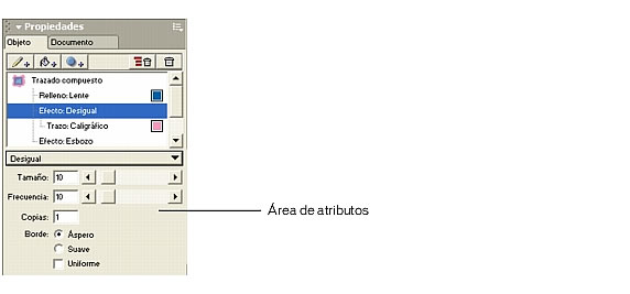 Cada efecto tiene distintos atributos que aparecen en el área de atributos de la parte inferior del panel Objeto al seleccionar un efecto.