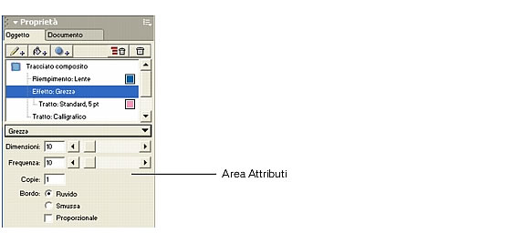 Ogni effetto dispone di diversi attributi, illustrati nell'area attributi in fondo al pannello Oggetto quando l'effetto è selezionato.