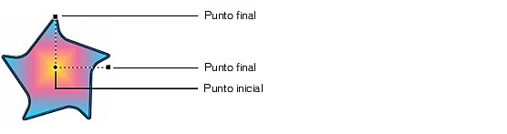 Los degradados de contorno tienen dos selectores. Aplican color de forma concéntrica seg�n la forma del objeto. El punto inicial determina el centro del degradado. El punto final permite ajustar la longitud del degradado, pero no su ángulo ni su forma.