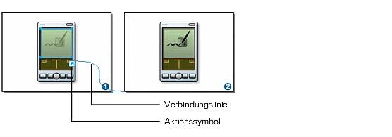 In der rechten unteren Ecke des Bildschirmobjekts wird ein Aktionssymbol angezeigt, und das Bildschirmobjekt und Seite 2 sind durch eine blaue Linie verbunden.
