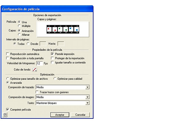 Aparece el cuadro de diálogo Configuración de película. Utilice este cuadro de diálogo para indicar cómo convertirá FreeHand las capas y páginas en fotogramas de una película Flash.