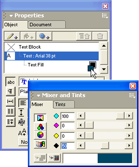 Drag the resulting new color from the Color Mixer panel's color box to the preview swatch of the Text Fill property in the Object panel.