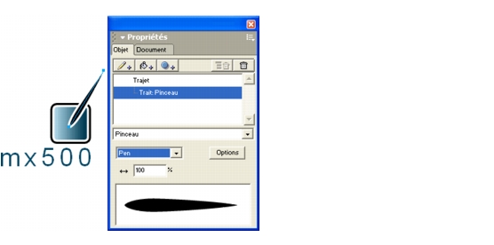 Cliquez deux fois sur licône en regard du symbole Pen Brush dans le panneau Bibliothèque, et sélectionnez lastuce pinceau dans la fenêtre de modification qui saffiche. |