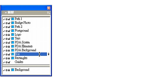 匯入 PNG 時,「圖層」面板中會建立並加強顯示幾個新的圖層:「Path 1」、「Bridge Photo」、「Box」和「Path 2」。這些圖層由 Fireworks PNG 定義。在這裡匯入時會保持名稱不變,因為您在「Fireworks PNG 匯入設定」對話方塊中選取了「記住圖層」選項。