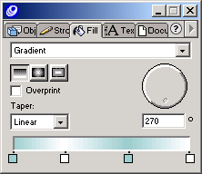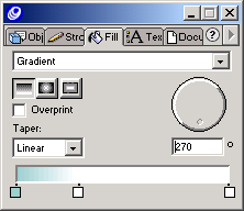 In the Fill inspector, choose Gradient from the Fill Type pop-up menu and set the Rotation value to 120 degrees. |