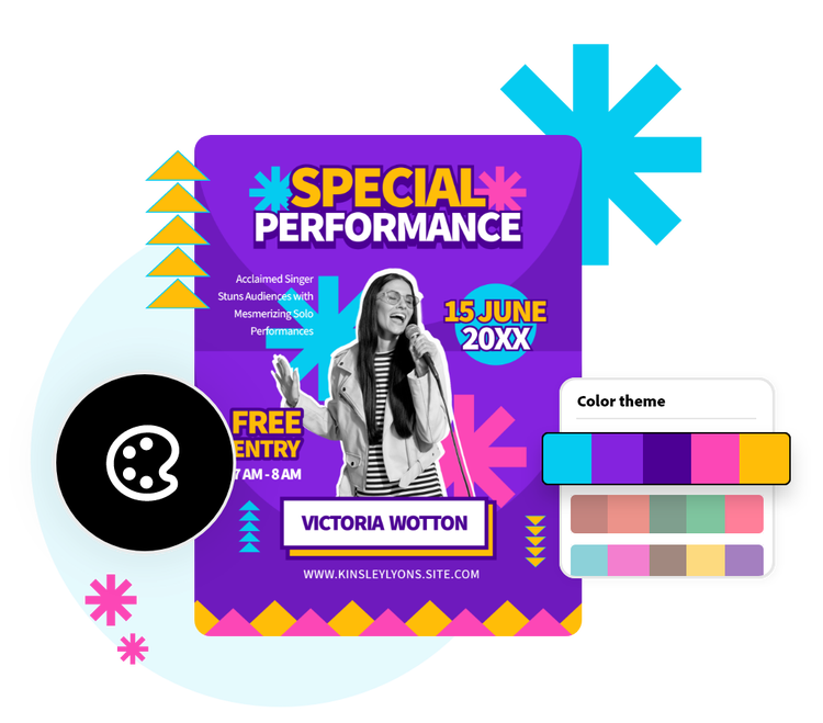 O Adobe Express gera paletas de cores automaticamente com base no seu design. Use o seletor de cores para editar a paleta ou adicionar tons específicos e o recurso Embaralhar para explorar variações da paleta no seu design. Chegue àquela cor perfeita com a ferramenta Conta-gotas. Aplique o Conta-gotas em qualquer parte do seu design ou em uma foto de fundo para testar a cor. O Adobe Express vai combinar e adicionar essa nova cor à sua paleta.