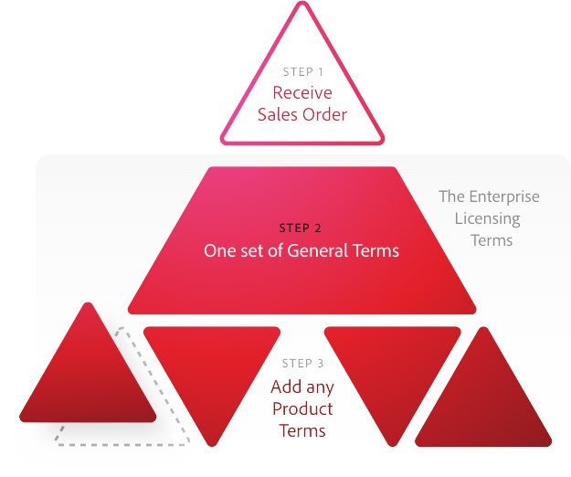This means you don’t waste time revisiting similar terms every time you want to add another Adobe product or service. The General Terms will apply to all of your Adobe enterprise needs.