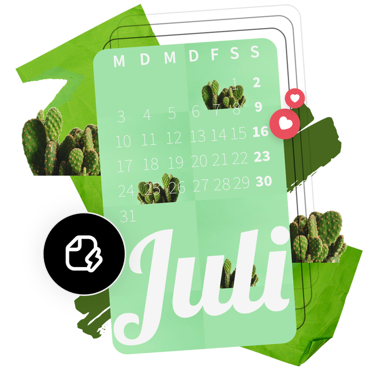 Entdecke professionell gestaltete Vorlagen, um direkt loszulegen, oder erstelle deinen Kalender von Grund auf neu. Lege ein Thema für deine Designs fest – mit Fotos, Symbolen, Logos, personalisierten Schriftarten und anderen anpassbaren Elementen, um ihnen einen authentischen Look zu verleihen. Dupliziere Designs und passe ihre Größe an, um über verschiedene Elementtypen hinweg konsistent zu sein. Füge der Tabelle Zellen hinzu, lösche oder ändere sie nach Bedarf. Mit Adobe Express kannst du deine Designs innerhalb weniger Minuten kostenlos und einfach erstellen, speichern und freigeben.