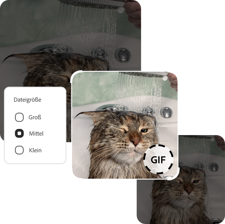 Du kannst ganz schnell mit Adobe Express aus einem Video ein GIF erstellen. Lade einfach dein Video von deinem Gerät hoch, wähle unter „Dateigröße“ die gewünschte Qualität und unter „Größe“ das Seitenverhältnis für das GIF aus, und schon bist du startklar. Mit Adobe Express kannst du aus jedem Video schnell und einfach ein hochwertiges GIF erstellen. Unabhängig vom Format deines Originalmediums – MP4, AVI, MKV, WEBM, FLV und andere Formate – erstellst du mit dem Tool „In GIF konvertieren“ innerhalb von Sekunden ein GIF aus deinem Video.