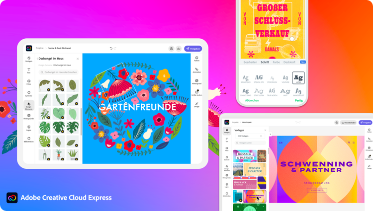 Mit Adobe Express stehen euch alle Tools und Funktionen zur Verfügung, um mit eurem Content zu überzeugen – ganz egal ob ihr lieber am Smartphone, Tablet oder am Rechner arbeitet.