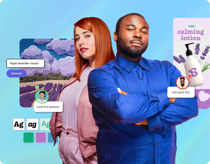 Garantiza que los proyectos se adapten a la marca y optimiza los flujos de trabajo con la integración de Adobe Creative Cloud y la colaboración en tiempo real.