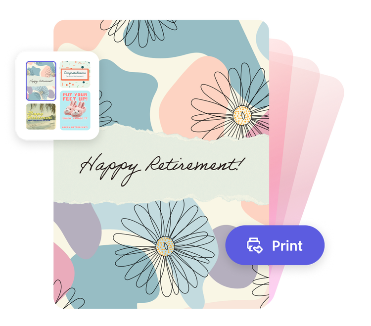 With the help of the Adobe Express retirement card maker, your employee or colleague will feel respected and appreciated upon their departure. After customizing your selected template with a personal message, color scheme, and photos, your design is ready to print. You can either download and print in the office or order high-quality prints right from Adobe Express if you’re a US, UK, Australia or Canada desktop user. Designing a special retirement card easier than ever now.