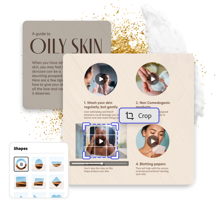 Adobe Express is loaded with thousands of free design assets such as royalty-free stock videos, images, graphics, and more to add to your video infographic. Crop your favorite videos instantly to your preferred dimension, then drag and drop them anywhere on your video template. Have logos, graphics, and other design assets of your own? Upload directly to your project and edit as needed for a personal touch.