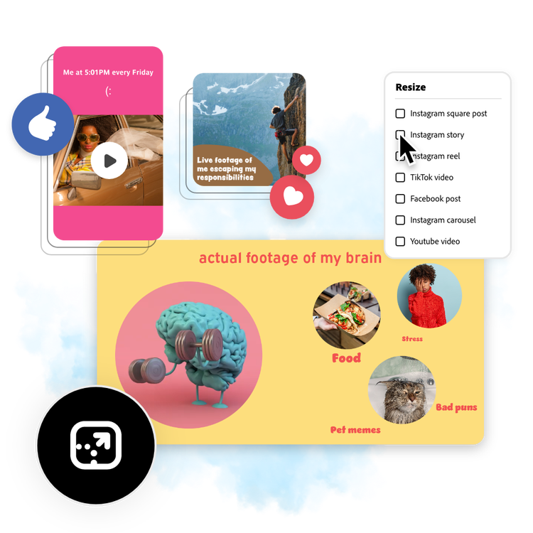 Every second matters when it comes to catching a viewer's attention long enough for a laugh. Trim down your clips within Adobe Express and nail the comedic timing to create a meme that goes viral. With a Premium plan, you can resize your video in one click to share it across your social channels and make the most out of your meme video.