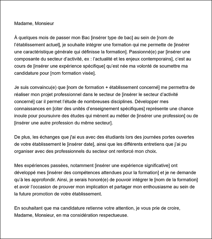 Chaque projet de formation motivé doit être adapté à la formation et à l’établissement concernés. Une lettre pour un BTS diffère nécessairement d’une lettre pour un IFSI ou une autre filière. L’objectif n’est pas de définir un métier final, mais de montrer l’adéquation entre votre profil et la formation demandée.