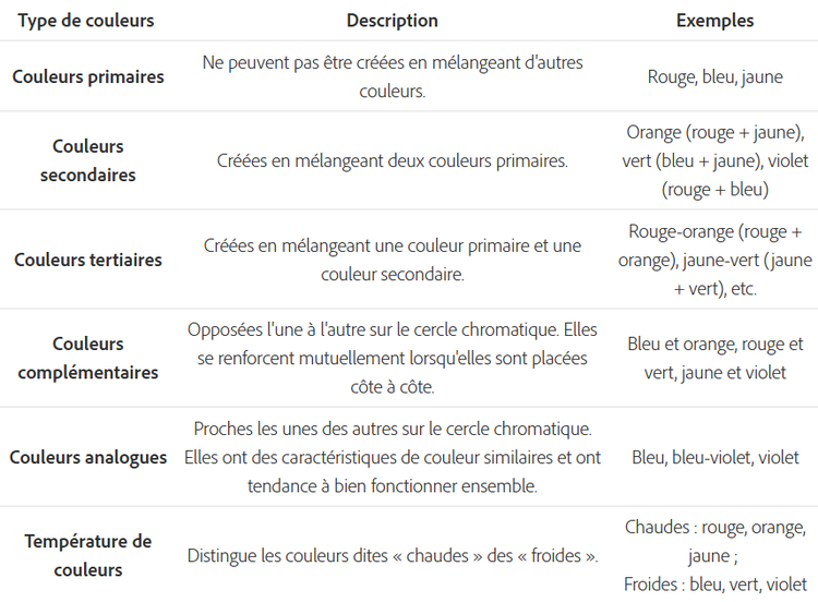 Enfin, on parle de couleurs analogues pour des couleurs proches les unes des autres sur le cercle chromatique. Elles ont tendance à bien fonctionner ensemble car elles ont des caractéristiques de couleur similaires. Le terme de température de couleurs, quant à lui, distingue les couleurs dites « chaudes » des « froides ». Le cercle chromatique peut ainsi être divisé en couleurs chaudes (comme le rouge, l'orange et le jaune) et en couleurs froides (comme le bleu, le vert et le violet).