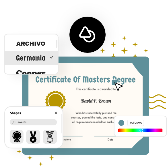 Akui prestasi orang lain dengan sertifikat indah yang dibuat dalam hitungan menit. Mulailah terinspirasi dengan ribuan foto, ikon, grafis Adobe Stock, dan lainnya untuk diseret dan dilepas ke dalam desain sertifikat Anda. Isi detail penerima sertifikat seperti nama, tanggal, dan prestasi dengan lebih dari 25.000 Adobe Fonts untuk dipilih. Tidak dapat memutuskan font mana yang akan digunakan? Adobe Express mendukung Anda dengan rekomendasi font pilihan hanya untuk proyek Anda.