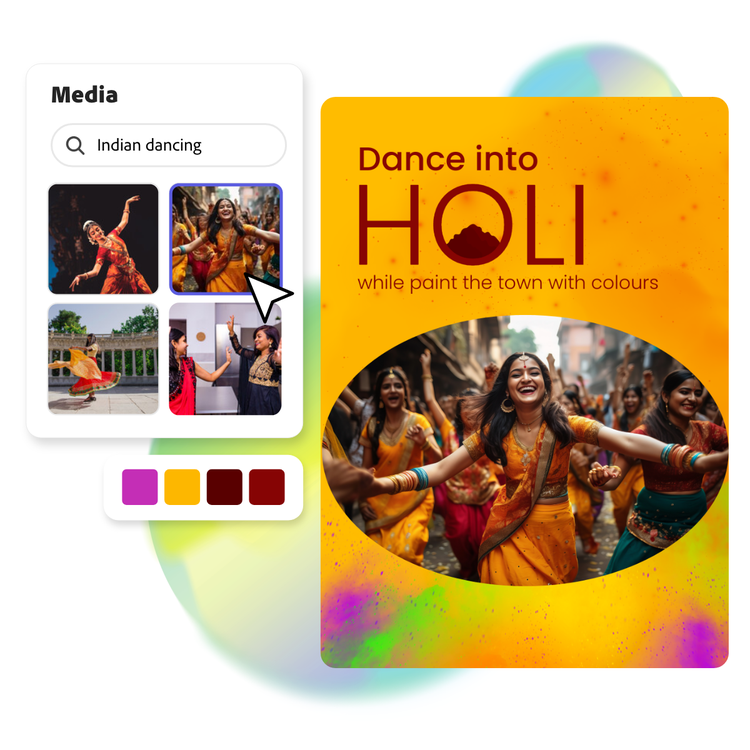 Card making is a fun group activity – especially when Adobe Express lets you share ideas and designs, making it a truly collaborative activity. Start by looking for images to illustrate the legends of Holi or simply use the image search to find coloured powder to represent the fun of the festival. To make your cards more personal, record Holi greetings, using the microphone on your device (you can do this in the app) and create a digital card that speaks to the recipient. This personal approach also works if you’re sending festival offers to customers.