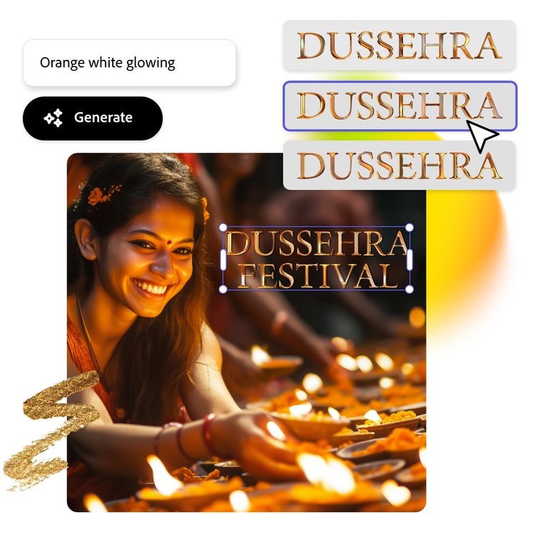 For a fabulous poster design, make your message stand out with the fabulous fonts and the Generate Text effect tool in Adobe Express. First upload your photo or illustration and crop it into a circle, half-moon or other interesting shape. Write your message and use the text layout to wrap it around the shape. Continue to explore the design elements and add festive decoration such as flowers or fireworks. With so many possibilities to choose from, you'll soon start to enjoy Dussehra poster making.