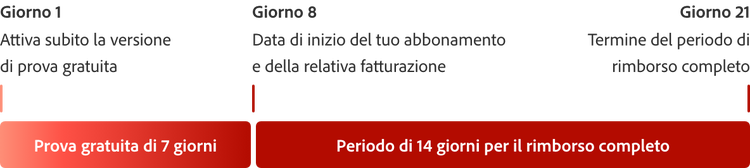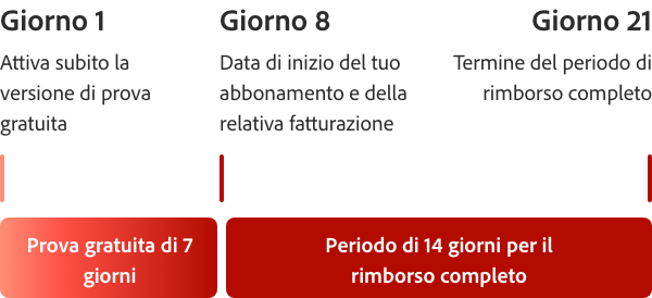 Prova Acrobat Pro gratuitamente per 7 giorni. Se dovessi avere bisogno di più tempo per provare tutte le funzionalità, avrai altri 14 giorni per annullare la tua iscrizione e ricevere un rimborso completo.