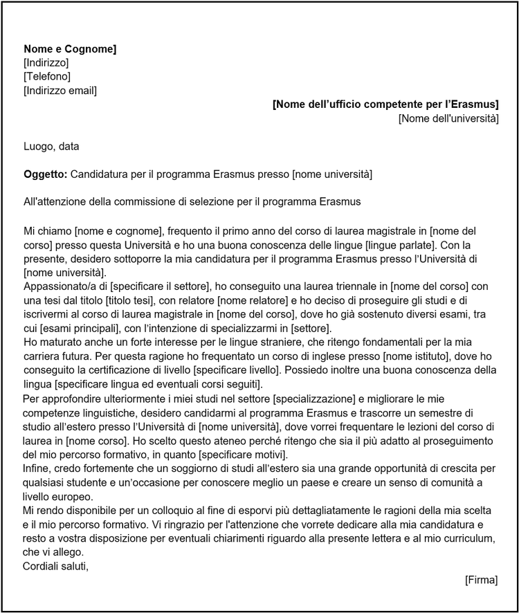 Anche se può sembrare di poca importanza, l’oggetto della lettera di presentazione per l’Erasmus è cruciale per catturare l’attenzione del lettore fin dall’inizio. Dovrai specificare chiaramente che stai facendo domanda per il programma Erasmus e includere la meta preferita e il nome dell’Università presso cui desideri svolgere il tuo periodo di studio all’estero.