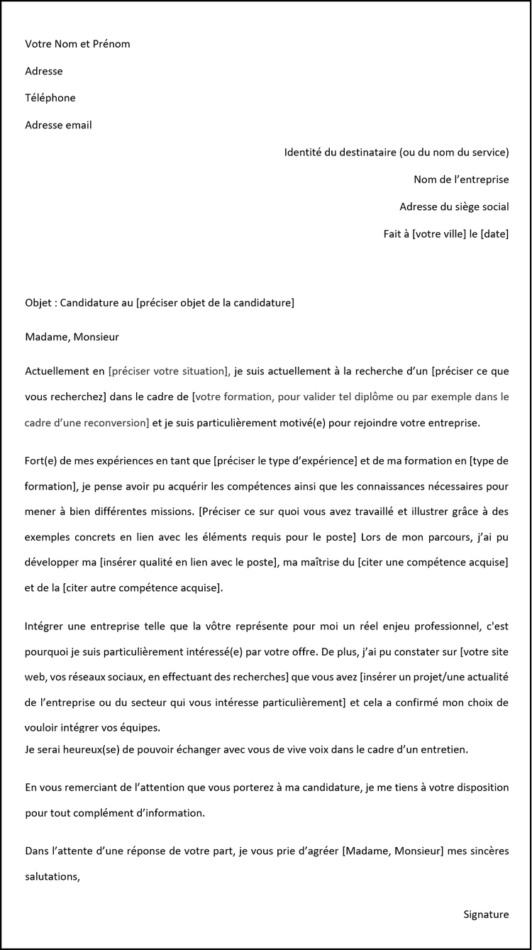 Oppure, per una candidatura spontanea: “Actuellement à la recherche d'un emploi, je me suis vivement intéressé(e) à votre entreprise dont le secteur d'activité (specificare il settore) correspond à mon domaine de compétences. C'est donc spontanément que je vous propose ma candidature pour un poste de (specificare la funzione)”.