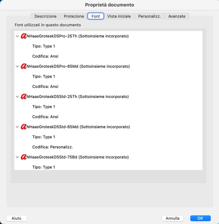 - Seleziona la scheda Font nella parte alta della finestra e controlla quali font sono già incorporati (sono quelli con la dicitura “Sottoinsieme incorporato” dopo il nome). Questi font sono già incorporati, mentre gli altri dovranno essere aggiunti manualmente.