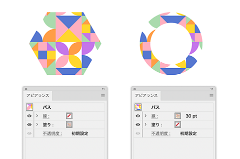 パターン編集モード中に表示されるパターンオプションパネルでは、タイルの種類や大きさを変更できます。モチーフに合わせた設定を行なえば、幾何学模様風のパターンの完成です。スウォッチパネルでパターンのサムネイルをクリックして、オブジェクトの線や塗りに自由に適用しましょう。