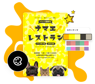 編集画面の上部にある「配色」を選択すると、オススメの「カラーテーマ」のリストが表示されます。キーワードを入力して色やテイストを検索し、お好みの配色パターンを見つけましょう。