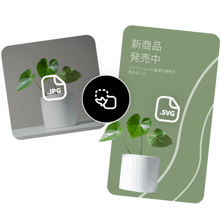 SVGのようなベクターグラフィックは、どんなに大きくしても小さくしても、常にその解像度を維持できるメリットがあります。JPGファイルをSVGファイルに変換して、ロゴ、インフォグラフィックス、イラストレーションなどに利用しましょう。