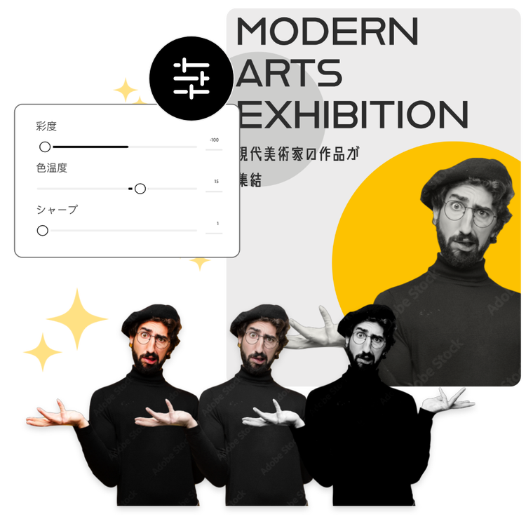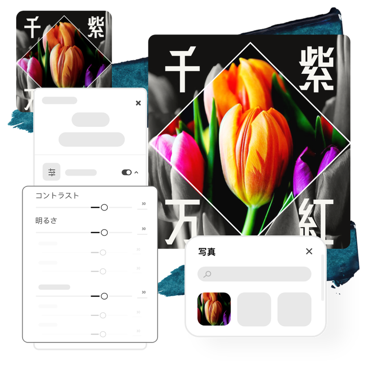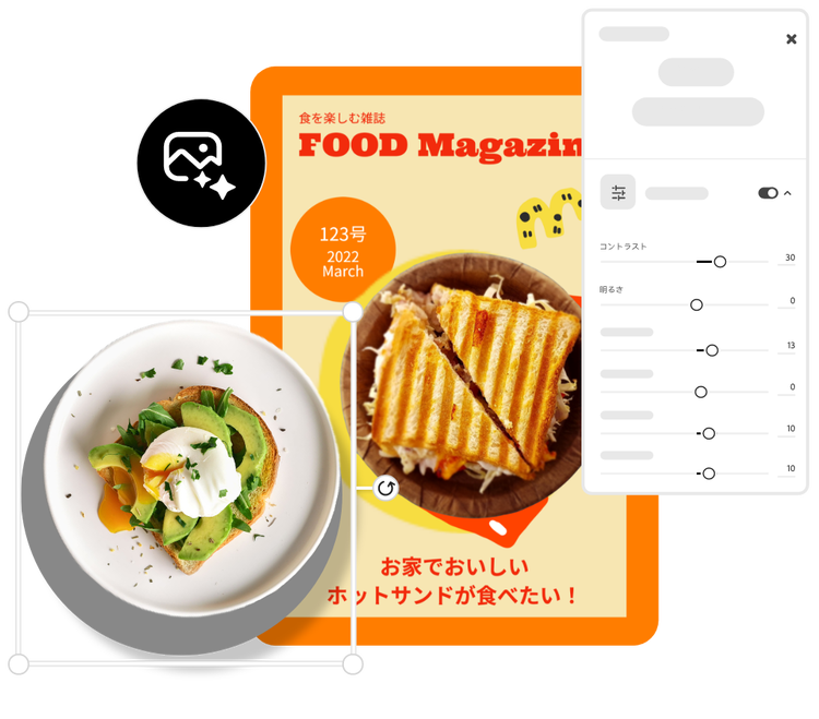 Adobe Expressの画像補正機能を使えば、写真の画質をすぐに上げられます。わかりやすい画面から調整機能を切り替えるだけで、自動的に画質が変わります。画像を背景として設定したり、不透明度を調節したり、上にテキストを重ねたりすれば、本格的なデザインが完成します。