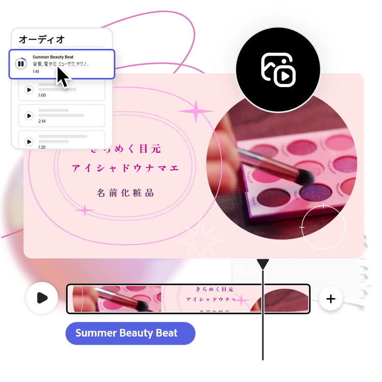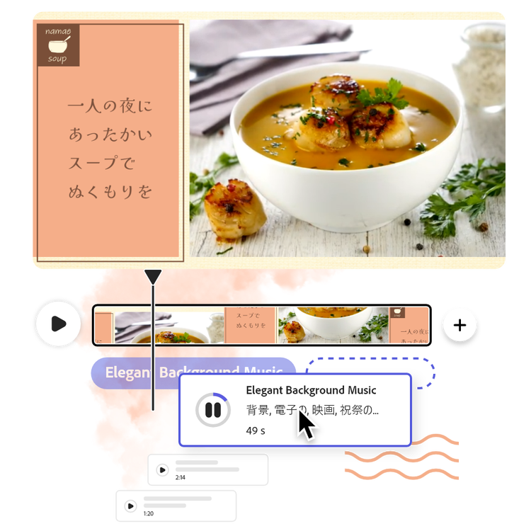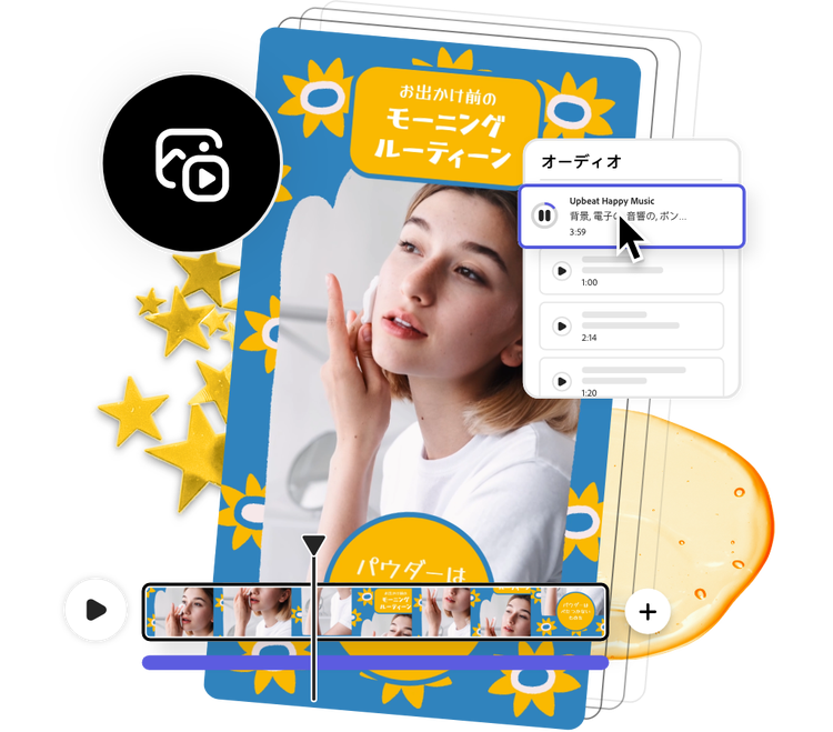 Adobe Expressを使うと、サウンドエフェクトや音楽、オーディオファイルを手軽に動画に追加できます。カンタン操作で、動画編集の経験がない方でも安心して使えます。
