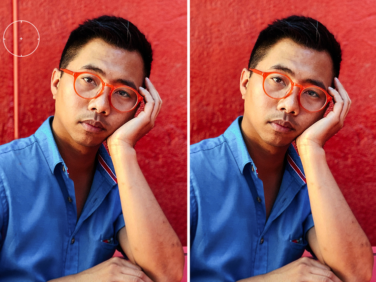 Med den nye funksjonen for innholdsbevisst fjerning kan du slette hva som helst på få sekunder. Bare velg et objekt eller en skavank, så vil {{lightroom-classic}} automatisk velge nærliggende områder i bildet og blande bort objektet/skavanken.
