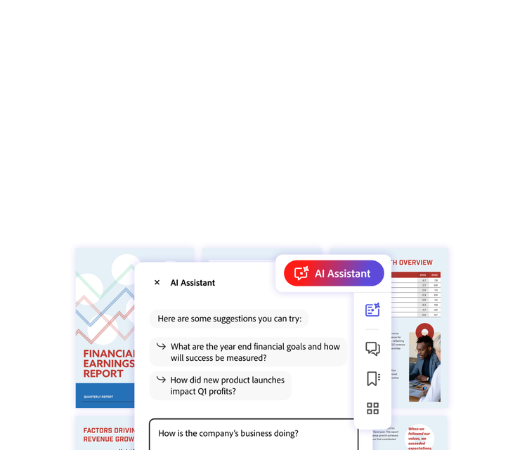 Unlock insights faster with Acrobat AI Assistant — summarize, analyze, and extract key findings from complex documents, complete with verifiable citations for audit trails. Teams can collaborate and manage knowledge in secure, centralized PDF Spaces, making it easy to turn static files into conversational knowledge hubs. And with Adobe Express, everyone can create standout, on-brand content at scale.