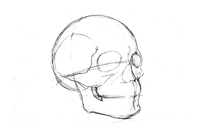 Practice drawing skulls from other views, like a true front view or side view, to get fully acquainted with the anatomy. When drawing a full profile of a skull, it can be important to remember that the spine doesn’t end at the bottom of the jaw; it goes up to the bottom of the back of the skull. “Everything connects to that little spot at the base of the skull,” says Elliott. “If you run your finger up the back of your neck, you can feel where it all connects.”