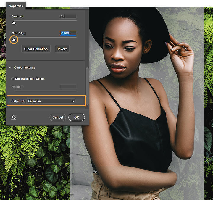 In the Properties panel of the Select And Mask workspace, move the Shift Edge slider to the left to refine the edges of the selection, and choose Output To Selection. Note: when leaving Select And Mask, the original background comes back; you’ll fix this in the next step.