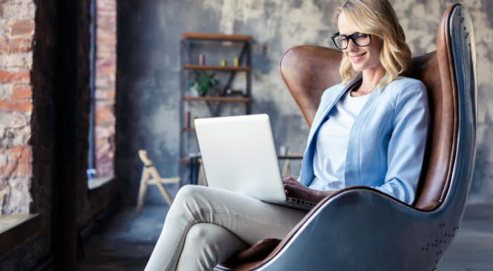 A woman with blonde curly hair and black glasses sits on a brown leather chair and reviews a loan agreement on her laptop computer.