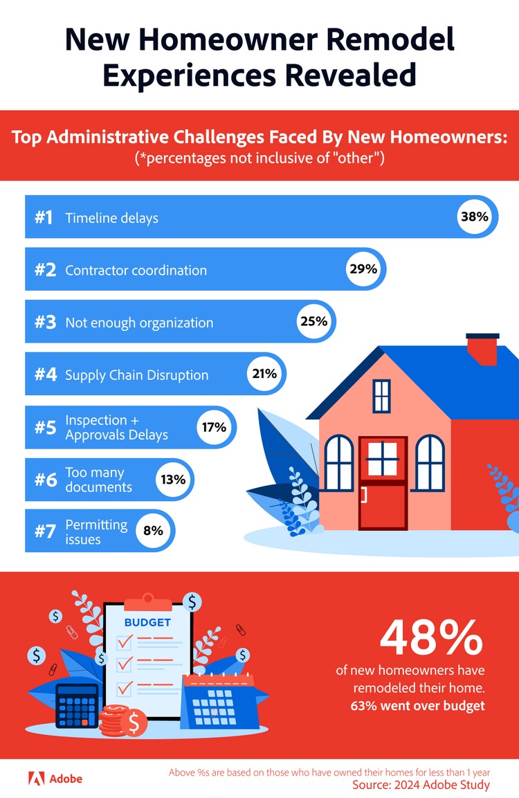 Our study also reveals the top administrative challenges encountered by new homeowners, including timeline delays at 37.50%, difficulties in contractor coordination at 29.17%, and issues arising from insufficient organization at 25%.