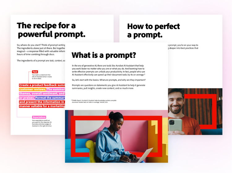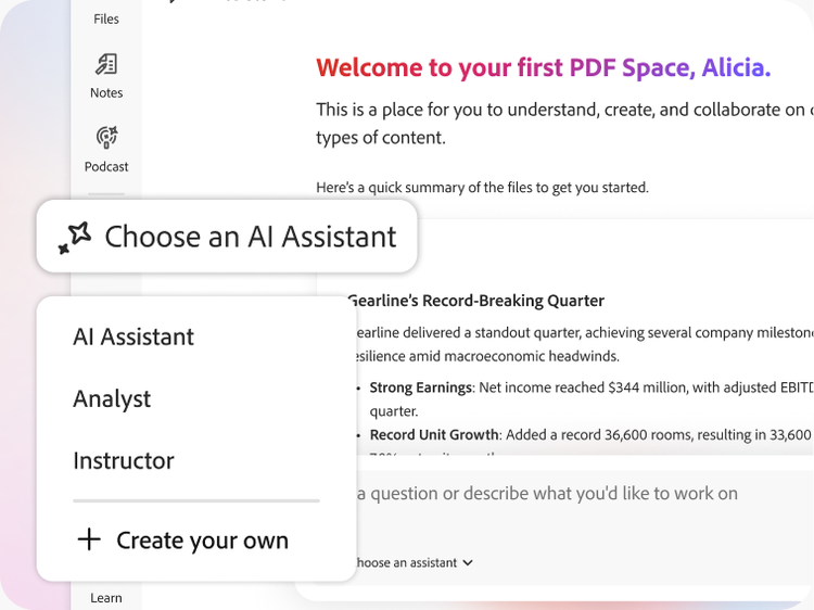 A trusted AI workspace like Adobe Acrobat Studio gives you an all-in-one space to complete document tasks and create your best work using AI Assistant to chat with documents, analyze data, summarize content, build standout work, and more. AI-generated summaries and other outputs are accompanied with trusted, precise citations. With Acrobat Studio, you can work confidently knowing your data is highly secure.