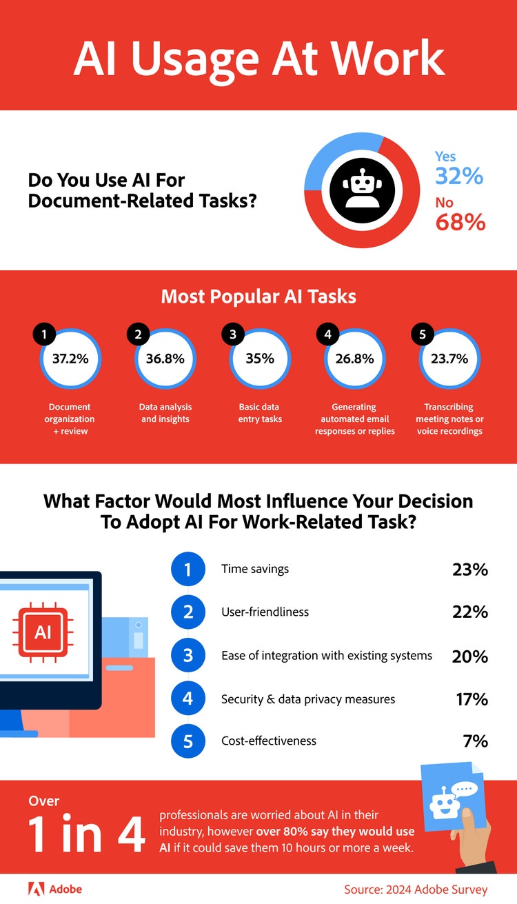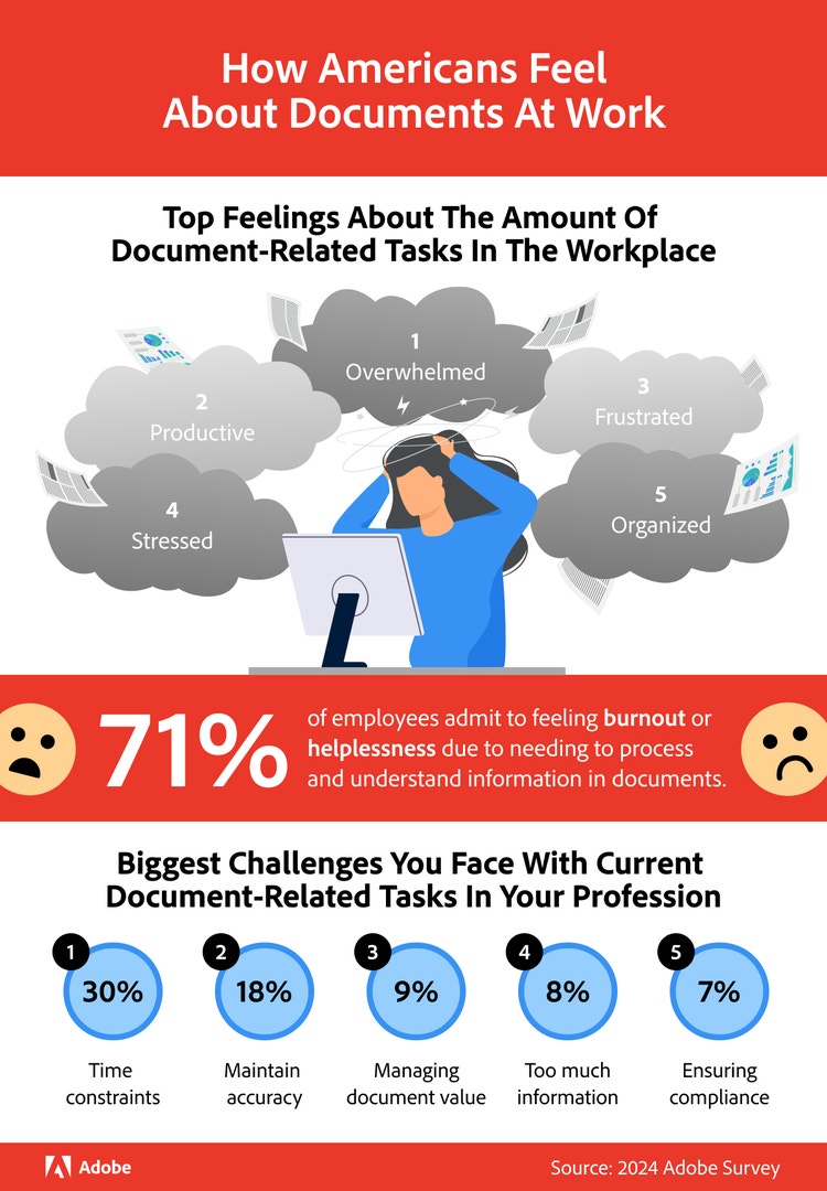 To showcase the real potential of integrating Adobe Acrobat’s AI Assistant into document management workflows, we surveyed over 1,000 employed Americans to learn more about how workers feel about documents and AI integrations at work. We then analyzed Acrobat AI Assistant and Bureau of Labor Statistics data to reveal the tangible time and monetary savings that this state-of-the-art technology can deliver.