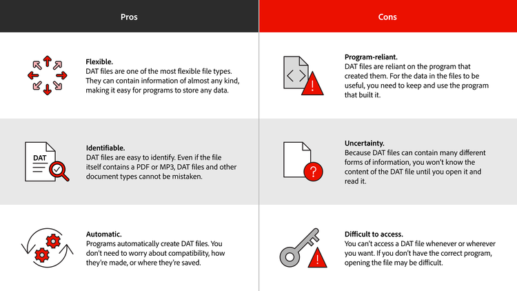 Different file formats have unique strengths and weaknesses depending on what you are trying to accomplish. This holds true with DAT files as well. Working with this file format comes with a specific set of advantages and disadvantages.