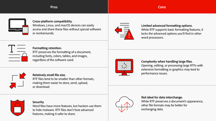 The RTF format has pros and cons, but it’s a good choice if you need to share small, text-based files with minimal formatting. However, it isn’t possible to password protect these files, which can cause security concerns. It’s also less popular than DOCX and PDF, which have more features.