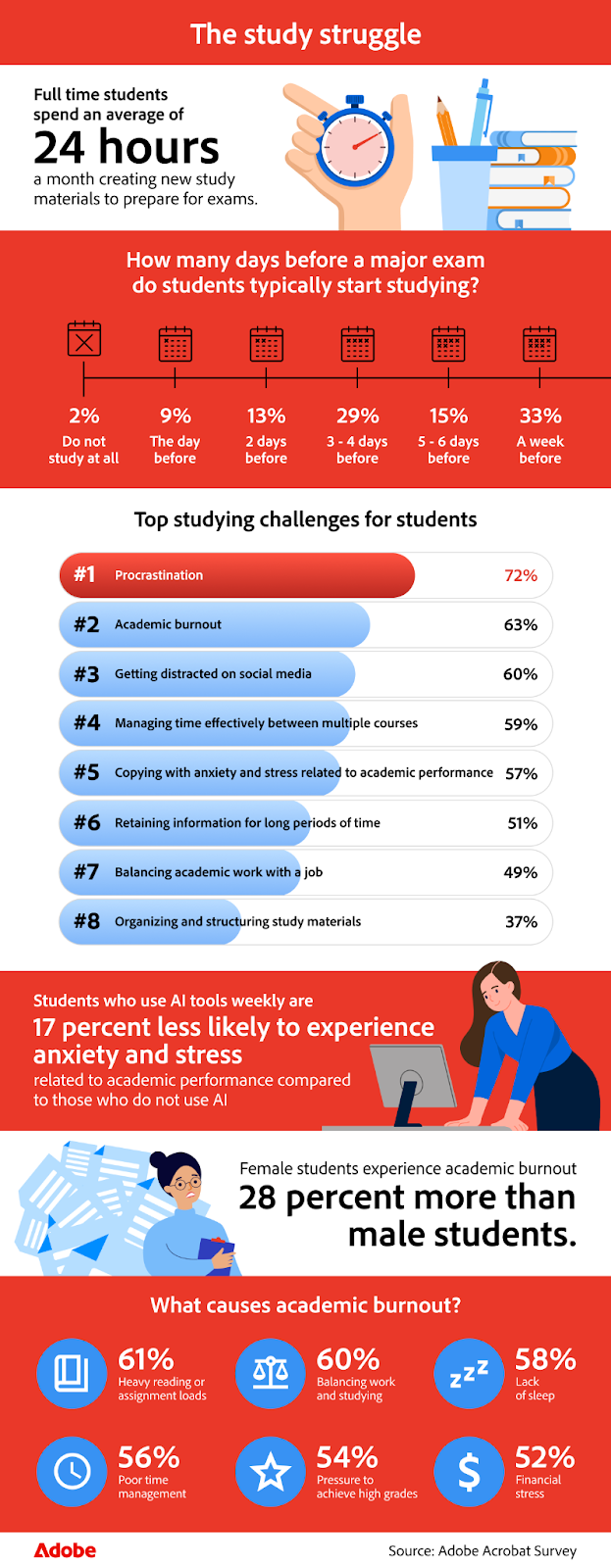 With academic demands and limited time, students are often seeking effective strategies to navigate these obstacles and optimize their studying. To help overcome these challenges, we found that over half of students surveyed utilize AI support on a weekly basis, finding it beneficial for breaking down complex content. AI tools, such as Adobe Acrobat AI Assistant, have emerged as new resources for helping students navigate lengthy texts, comprehend difficult vocabulary, and improve overall understanding.