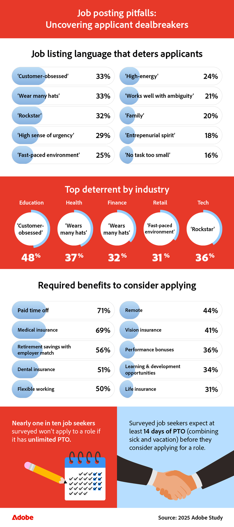 Job searching can sometimes feel like a full-time job in itself, and with hundreds of submitted applications leading to only a handful of interviews, job seekers are becoming more selective with their time. On average, job seekers are willing to spend around 30 minutes per application, so deciding which jobs are worth their time is key. Whether it's missing benefits or has cringeworthy terms like "customer-obsessed," specific details can turn candidates away.