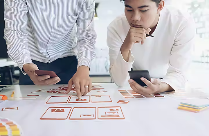في مرحلة النمذجة الأولية، يجب على فريق التصميم إنشاء نماذج أولية بسيطة منخفضة التكلفة لعدد من أفكارك في جلسات العصف الذهني. لا يجب أن يكون النموذج الأولي الخاص بك خيالي أو مكلف. يمكن أن يكون أي شيء من سلسلة من ملاحظات مكتوبة إلى نموذج رقمي تفاعلي من التطبيق أو موقع الويب باستخدام برنامج مثل Adobe XD. وعندما يقع المستخدمون في مشاكل، لا تيأس. فجزء النمذجة يكون للكشف عن المشكلات. كلما فشل النموذج بسرعة، وصلت إلى حل أفضل أسرع.