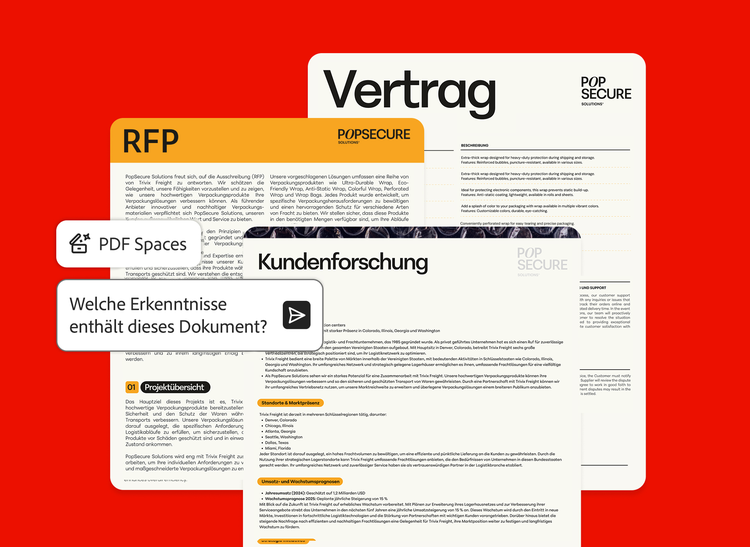 Verwandle Dateien und Links in eine interaktive Wissenssammlung. In den PDF Spaces kannst du mit deinen Dokumenten chatten und erhältst schneller die gesuchten Informationen, inklusive genauer Quellenangaben.