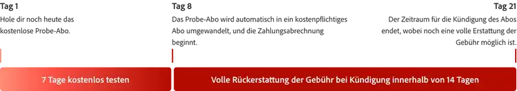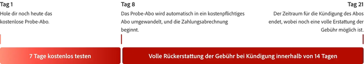 Du kannst Acrobat Pro 7 Tage kostenlos testen. Du brauchst mehr Zeit, um alle Funktionen auszuprobieren? Kein Problem – wenn du innerhalb der ersten 14 Tage nach Abschluss kündigst, gibt es eine volle Rückerstattung.